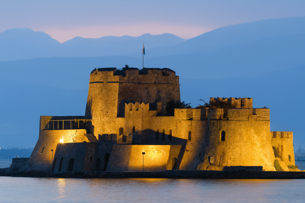 Entre sus símbolos más destacados se encuentra la fortaleza de Palamidi, construida por los venecianos en el siglo XVIII. Desde allí se obtienen vistas espectaculares del mar y de la ciudad, especialmente al atardecer. La subida de sus famosos “999 escalones” es todo un reto, aunque también puede accederse en coche. Otro emblema es Bourtzi, la pequeña fortaleza situada en un islote frente al puerto, accesible en barco y perfecta para fotografías memorables.